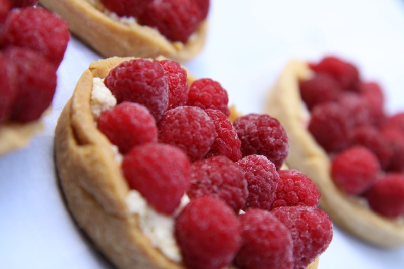 Preheat oven to 180 C. Lightly grease 8 individual tart tins. I used 8 cm diameter shallow tins with removable bases. If you don’t have individual tins you could just use a 20 cm diameter spring form tin and make one large tart. Carefully cut out the pastry to fit the tins, line the tins with the pastry rounds and carefully prick the insides with a fork. Place in the freezer for 10 minutes before baking. Blind bake using your preferred method for 10 minutes and then remove whatever you have used to weigh down the pastry and return to the oven for another 5 -6 minutes, or until lightly golden. Remove from the tins and cool on a wire rack. In a medium glass bowl beat together the ricotta, cream, icing sugar and vanilla until smooth. If making ahead, you might need to beat the mixture again just before serving as it will thicken a little in the fridge. When ready to serve, fill the pastry shells with the smooth ricotta and top with the raspberries. You can fill a couple of hours before serving, but any longer and the pastry might suffer and become limp and soggy. Dust with some extra icing sugar or a drizzle of chocolate ganache if you wish, or serve just on their own in all their bejeweled and creamy glory.
