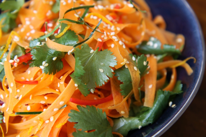This salad takes the humble carrot and makes it a star, by adding chilli, coriander, lime and sesame, and a tangy citrus dressing. It was a spectacular spring day today, and every mouthful was a pleasure as we ate it for lunch, with the sun shining, a light breeze in the air, and us in short sleeves and bare feet for almost the first time this season. We counted our blessings, grateful to live in such a beautiful place.