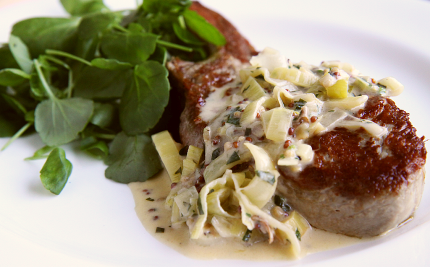 Heat a small frying pan over medium heat. Add the garlic, butter and leeks and cook until softened. Turn up the heat a little and add the wine. Cook for a couple of minutes until it reduces a little, then add the mustard and stock, turn the heat down again and simmer gently while you cook the pork. In another pan heat olive oil over high heat and then cook the chops until they are just done, Don’t overcook. A couple of minutes before the pork is cooked add the cream and parsley to the sauce, turn up the heat and stir gently until it thickens slightly. Season to taste with the sea salt. Serve the pork with the sauce spooned over the top, with the watercress on the side as a fresh, slightly peppery accompaniment.