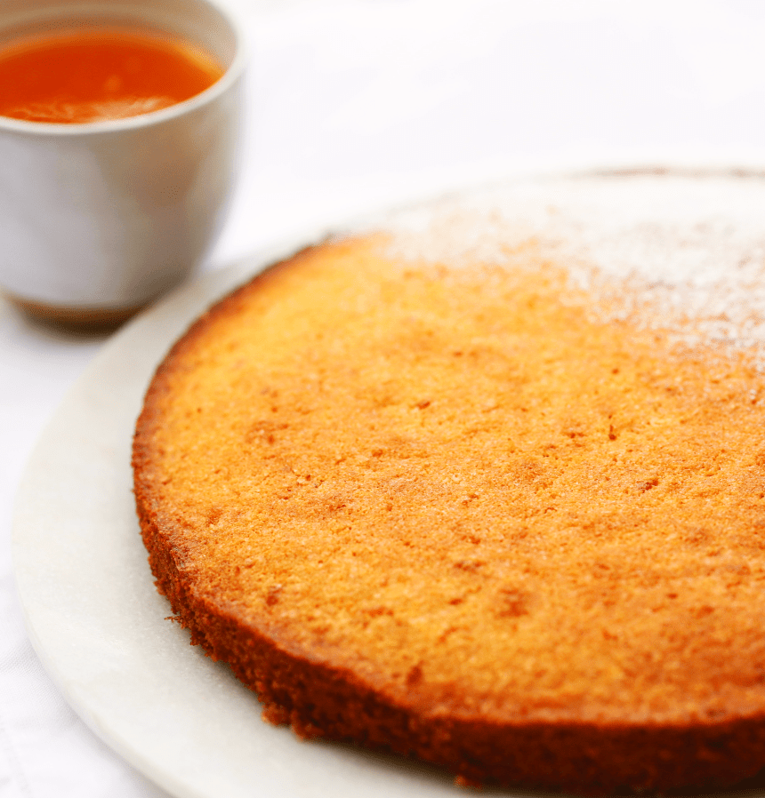 Preheat oven to 165 C. Lightly grease a 22 cm diameter springform tin and line the base with silicon paper. In a medium sized bowl beat together the butter and sugar until pale and fluffy. The sugar will not completely dissolve, as the crystals are quite large. Add the eggs one at a time, beating well between each addition. Add the almonds, polenta and orange zest and beat for 1 minute. Finally, add the orange blossom water and baking powder and beat for another minute, making sure they are well incorporated. Turn the batter into the tin and carefully spread out evenly with a flat bladed knife. Bake for 40 – 45 minutes, or until the cake springs back lightly when gently pressed with your fingertips. It should be golden and evenly risen. Carefully remove from the tin and turn onto a serving plate. Cool to room temperature.