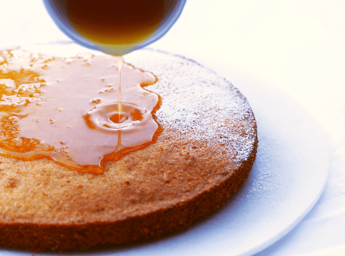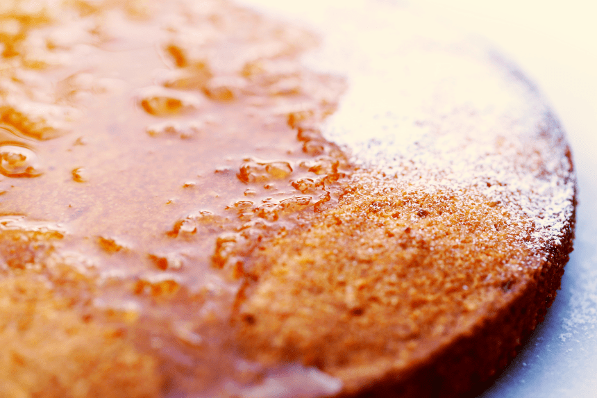 When ready to serve, dust one half of the cake with icing sugar. Two choices now – serve the cake and pass the syrup around for people to pour on their own slice, or dramatically pour the syrup over the whole cake at the table and then serve individual slices…. I’m firmly in the pour-over-the-cake-then-serve camp.